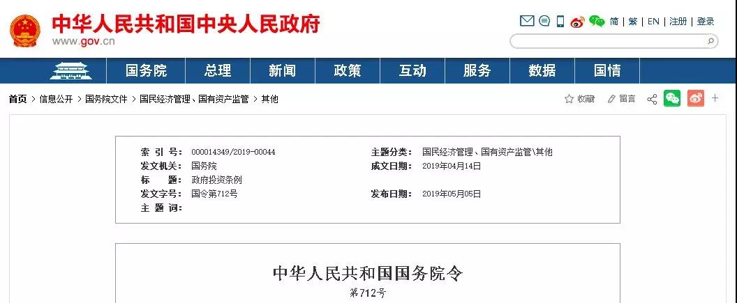 國務(wù)院總理李克強簽署國務(wù)院令,公布《政府投資條例》,自2019年7月1日起施行。